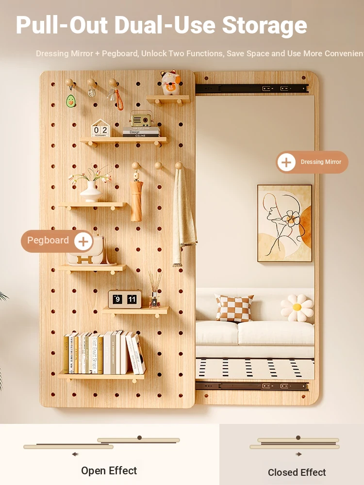 Solid Wood Pegboard Full-Length Mirror with Storage Rack - Entryway Organizer with Mirror for Wall-Mounted Space Saving Solution