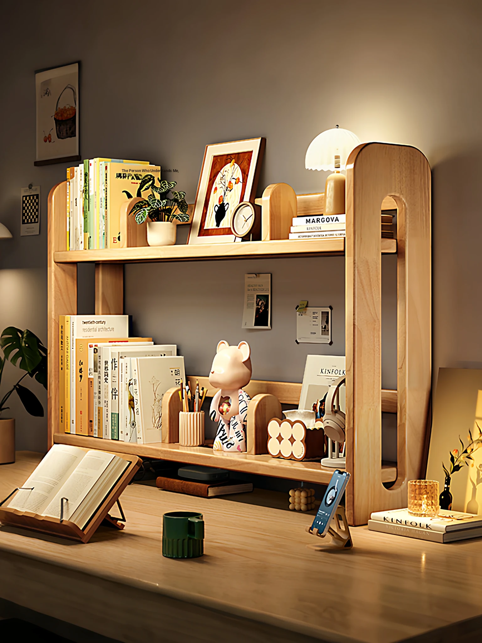 Elegant Solid Wood Desktop Bookshelf - Dual-Layer Vertical Storage Rack for Optimal Space Utilization and Stylish Book Organization