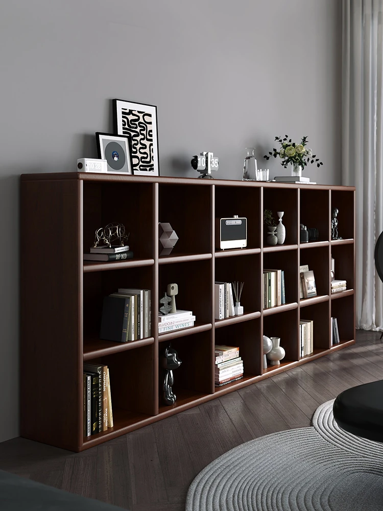 全実木製アメリカンスタイルのフロア書棚 - 壁にぴったりフィットし、自由に組み合わせ可能な収納書庫!リビングに最適なグリッドデザインで、スッキリした収納とスタイリッシュなインテリアを実現。