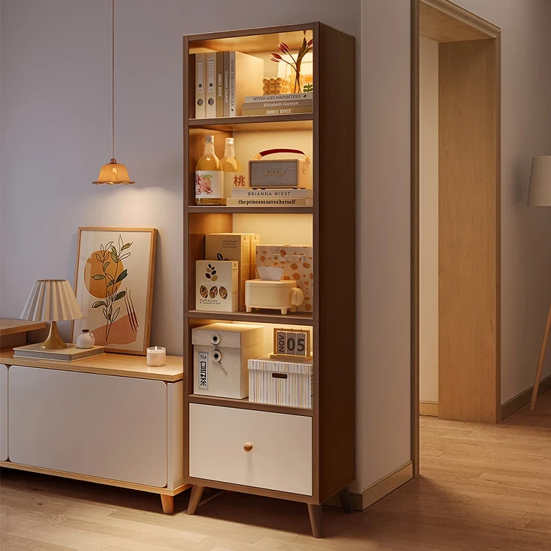 リビングにぴったり!多層のフロア書棚兼収納ラック - 壁際に置けるシンプルなデザインで、家族の本や小物をすっきり整理!収納力抜群の便利なキャビネット。