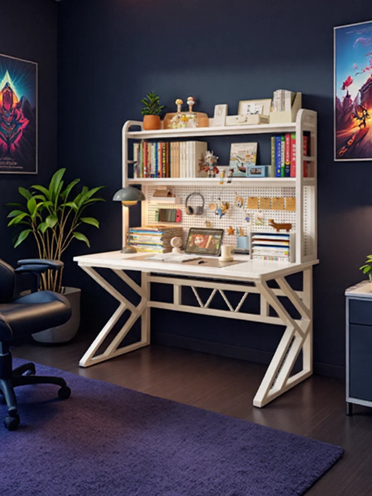 ホワイトのゲーミングデスク - シンプルモダンな一体型デザイン、デスクトップボード付きで収納力抜群!自宅や寝室に最適な作業台として、スタイリッシュな空間を演出します。