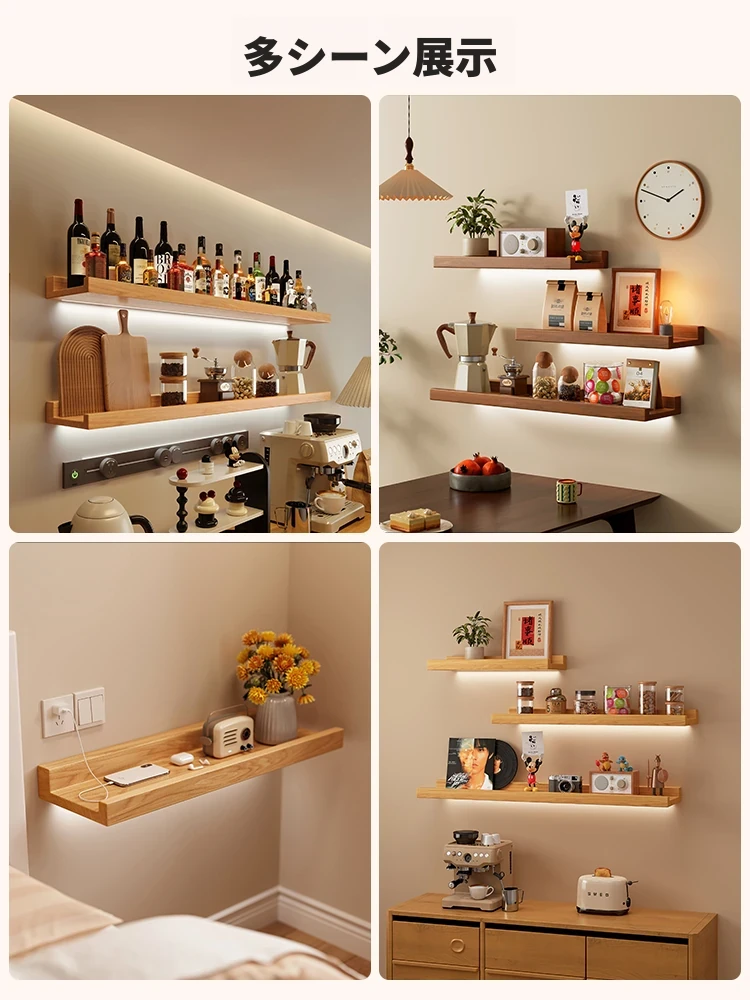 LEDライト付きの無垢材壁掛けシェルフ - おしゃれな一文字型ディスプレイラック、寝室のベッドサイドにもぴったりな壁面装飾棚!収納とインテリアを両立させるアイテムです。